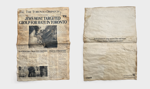 Last year in Toronto, the Jewish community remained the most targeted group for hate crimes with 70 total reported cases. We needed to find a way to build awareness of the current prevalence of antisemitism and the best ways to combat it. We created 70 newspapers: one for each antisemitic crime reported. The papers featured real stories of antisemitism that took place in the past year, but depicted them in a way that felt archival to convey the idea that antisemitism is not old news.